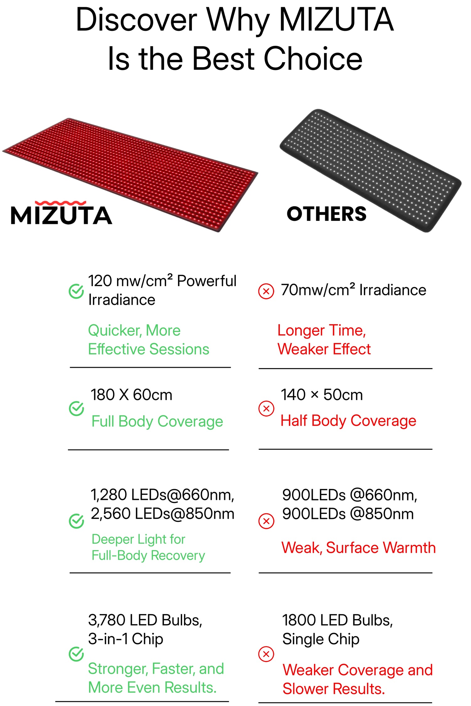 MIZUTA’s advanced LED matrix covers your entire body evenly. No weak spots, No wasted light.